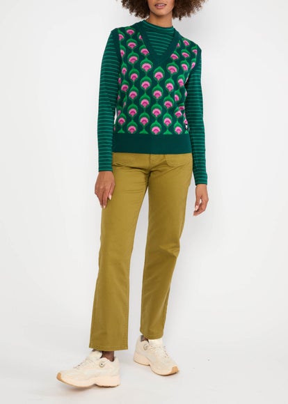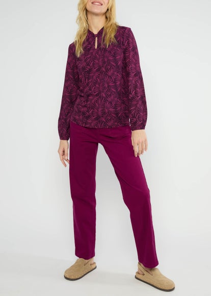100% bio-katoen. Mooie flarebroek van katoentricot. Brede tailleband, valt lang maar krimpt ietsje bij de eerste wasbeurt. Valt op maat