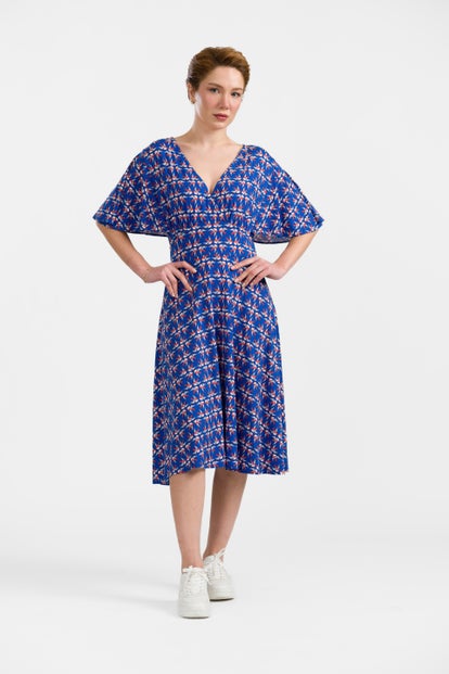 95% eco-viscose 5% elastan. Mooie jurk met een overslag, aansluitend in de taille en een a-lijn rok. Valt op maat