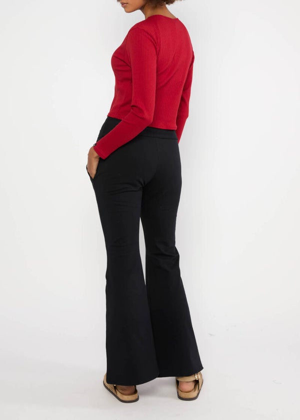 92% bio-katoen 8% elastan. Heerlijk warme flare-broek van joggingstof. Brede taille band en steekzakken. Valt op maat